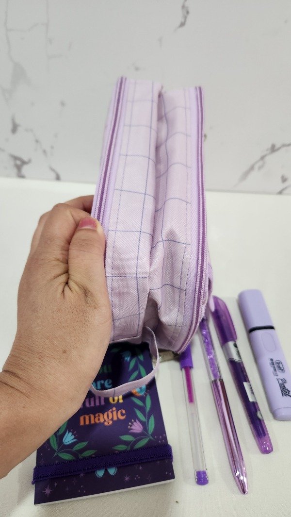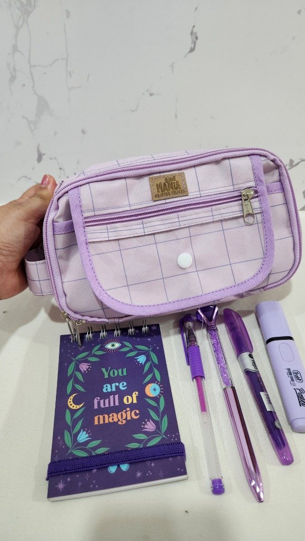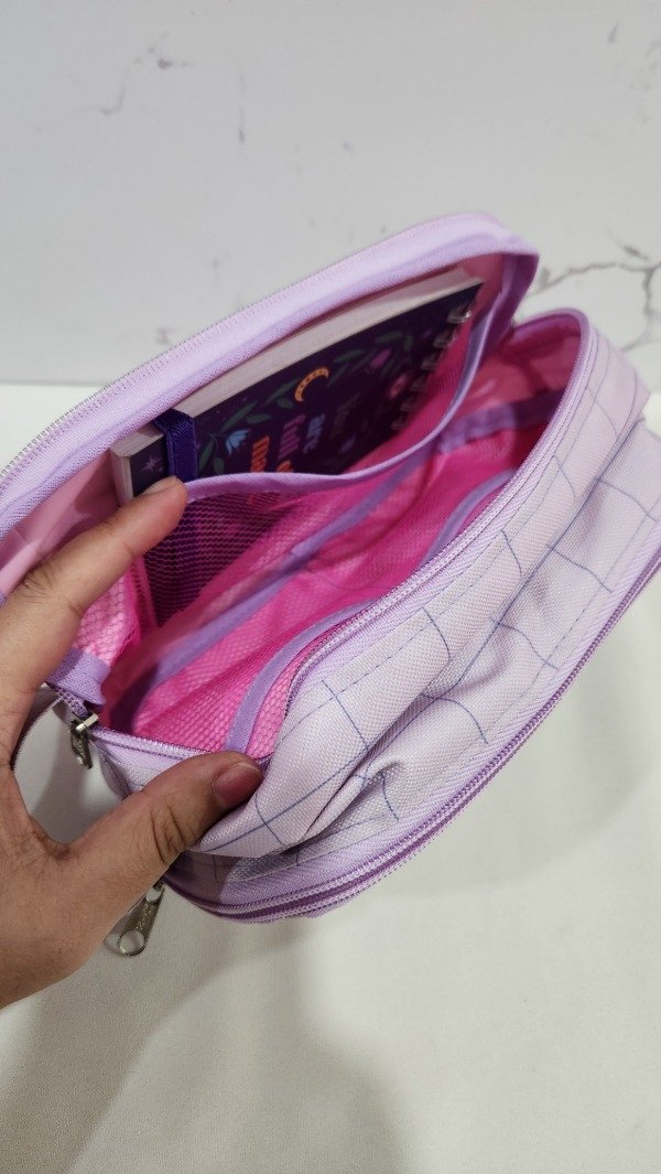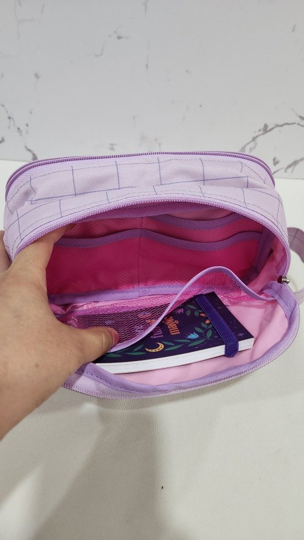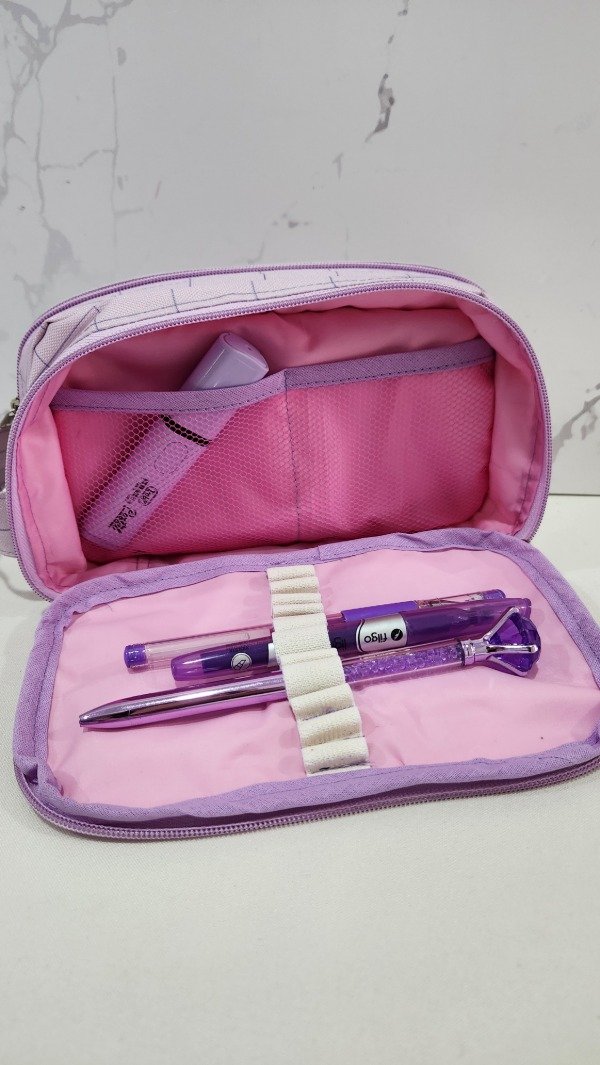 cuenta con muchos compartimentos es super amplia tiene elástico para poner lapices . Es muy útil para las que tienen que llevar muchos útiles. Especial para maestras , maestras jardineras o las que estudian para maestra.