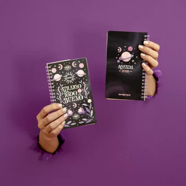 Tapa semi rígida, con terminación en papel texturado mate. Con hot stamping, elástico y anillado a tono de cada diseño.