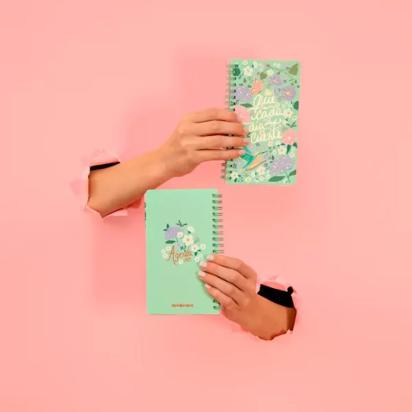 Tapa semi rígida, con terminación en papel texturado mate. Con hot stamping, elástico y anillado a tono de cada diseño.
