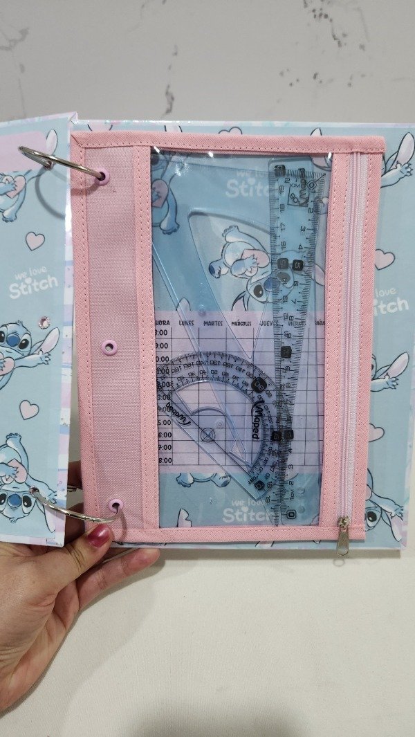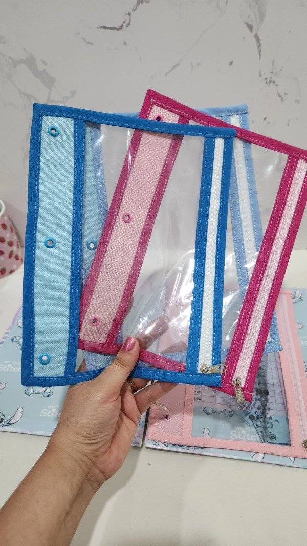 Sobre con cierre y ojales para enganchar en carpeta . Ideal para llevar el set de geometría.