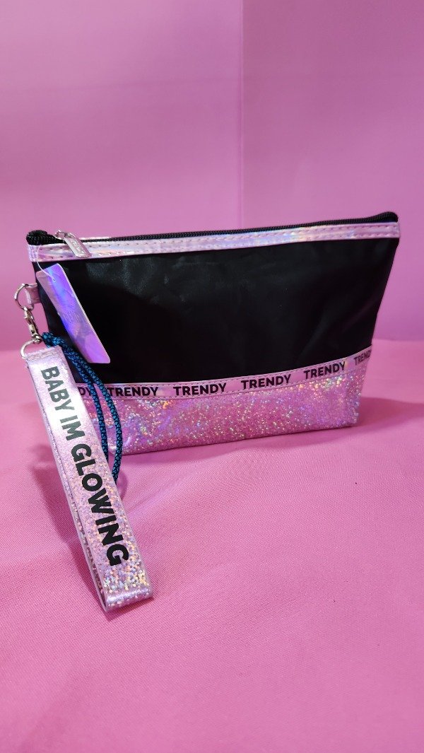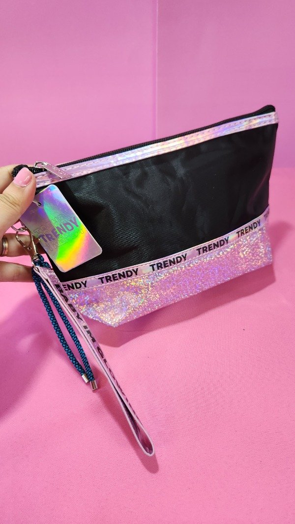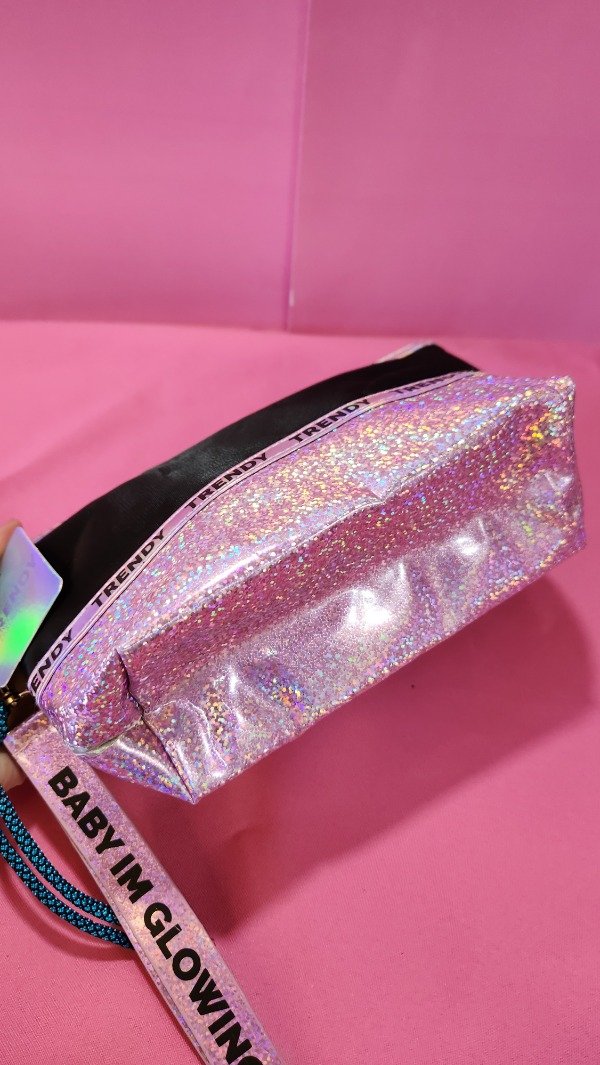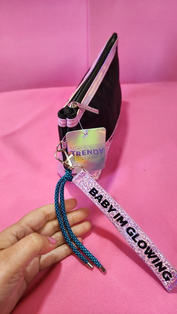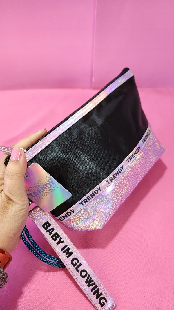 Neceser Negro con detalles en holográficas con correa para llevar colgando . Hermoso