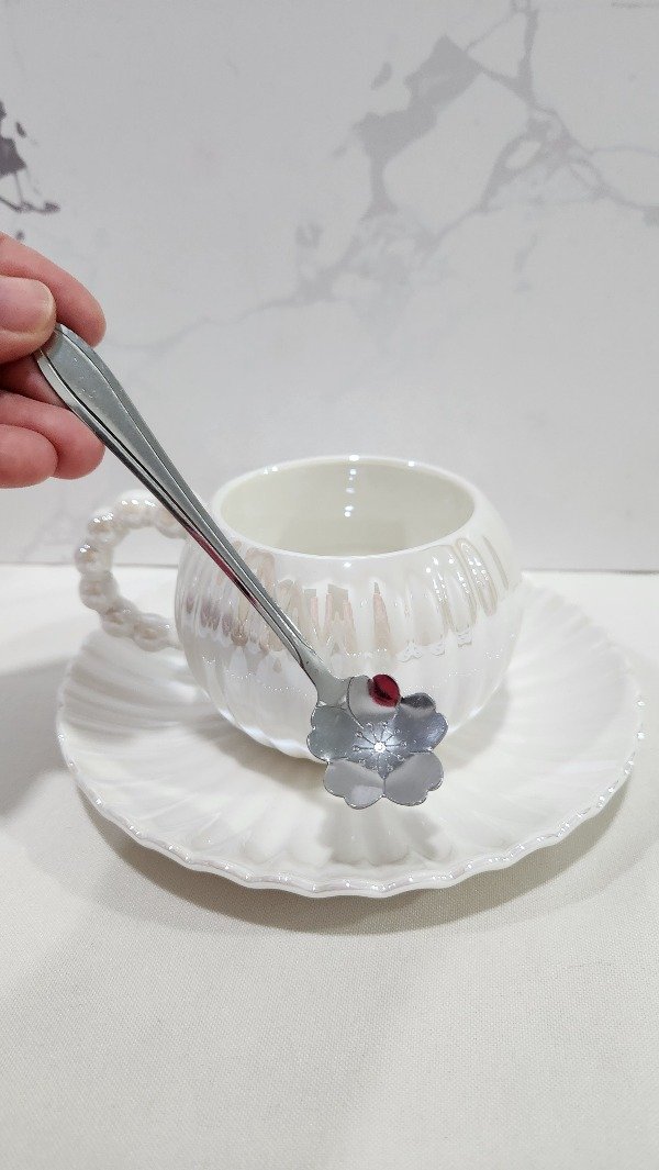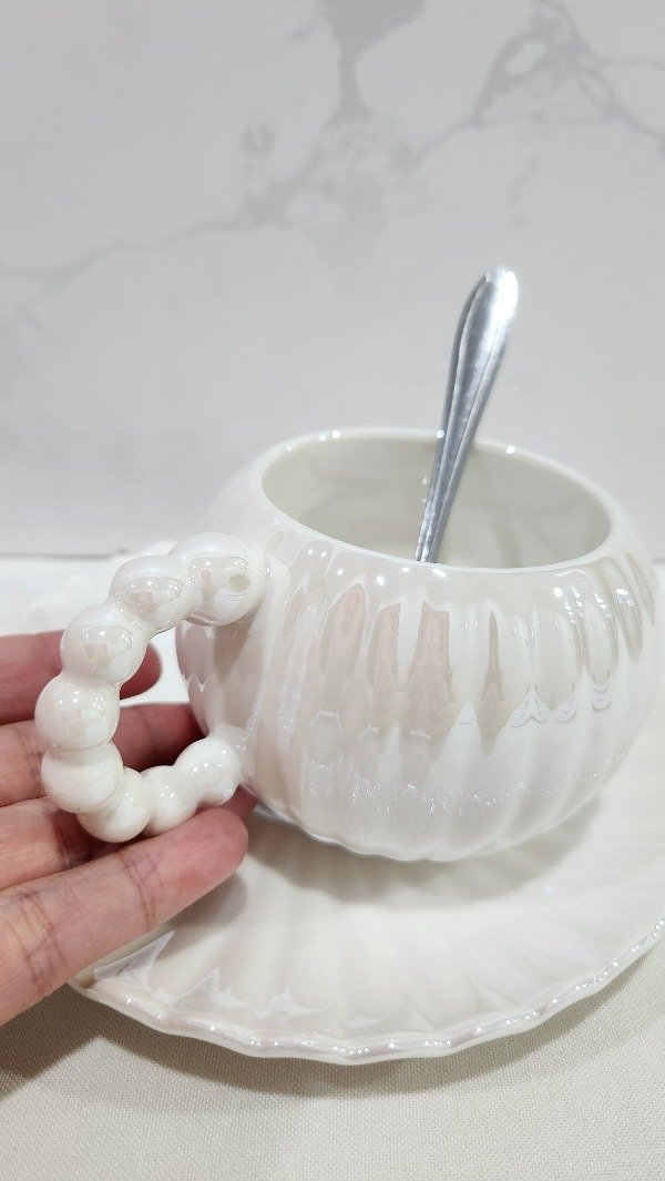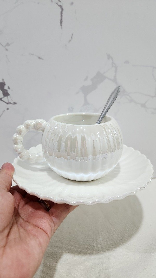 TAZA DE cerámica tornasolada divina , viene con el plato y la cuchara de metal. Es hermosa super delicada .