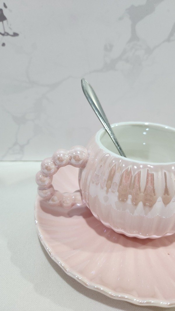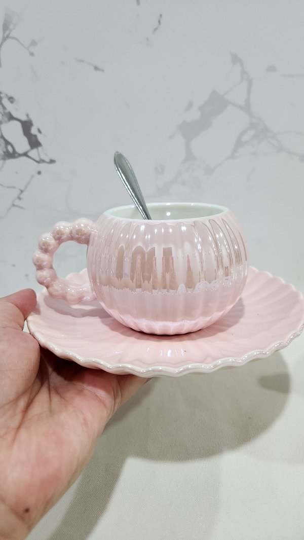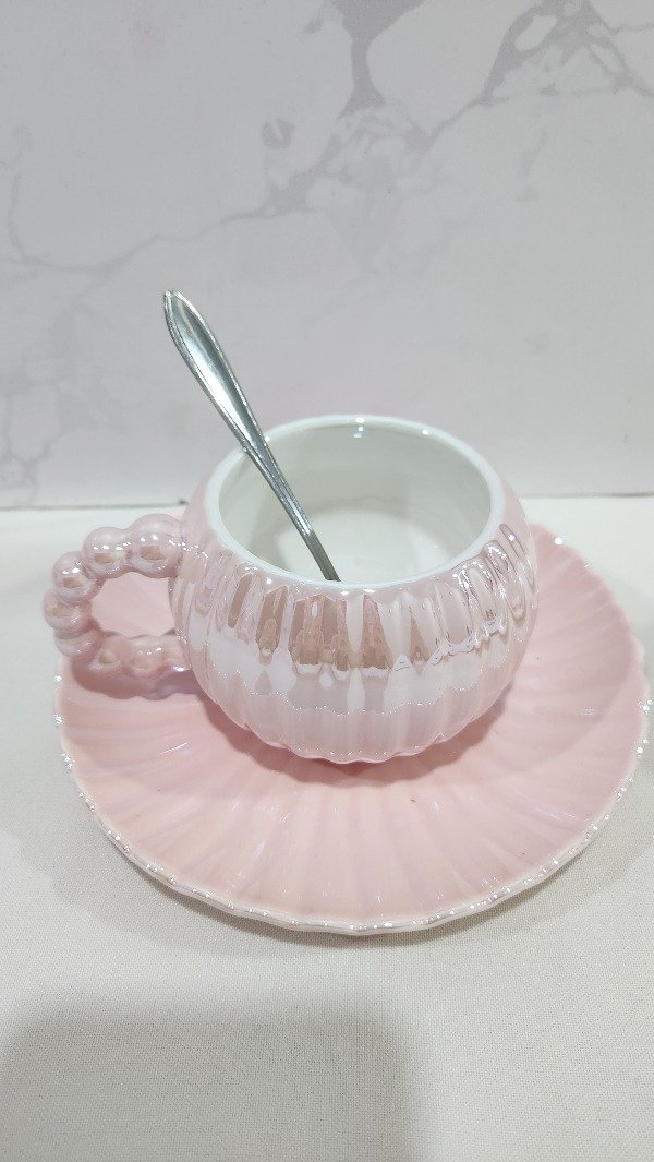 Taza Tornasolada Rosa + Plato + cuchara